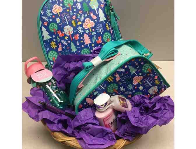 Petit Collage oil cloth lunch box and backpack, Crocodile Creek water bottle, Paris Amour hand lotion, and Sparkle Champagne hand sanitizer.
