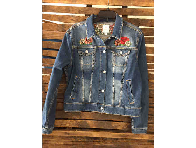 Brand new Lularoe Harvey jean jack in a sz XL. Darling floral embroidery on front and back.