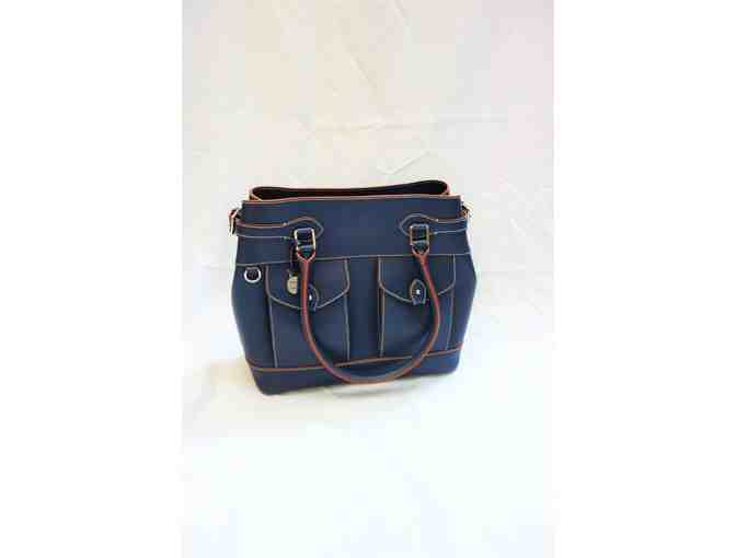 This gorgeous navy blue leather handbag with cognac trim is the perfect size purse for your daily needs!