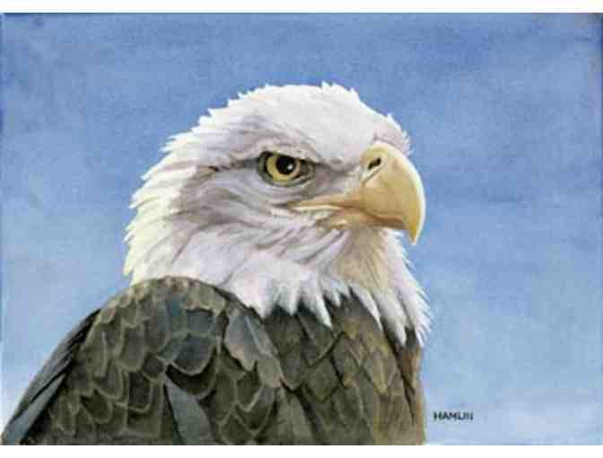 "I've been fortunate to photograph Bald Eagles in the wild many times in the past few years. I had wanted to do a classic "portrait", but it's impossible (not to mention illegal) to get close enough to a wild bird to capture the level of detail needed for the painting I envisioned. This bird was one of two males at the Vermont Institute of Natural Science raptor re-hab facility in Quechee. He had been injured in a collision with a car and, despite the excellent care provided by the staff vet, he would not be able to survive in the wild. He provided me with just the opportunity I was looking for, and the November sun helped by bathing him in warm back-lighting."
