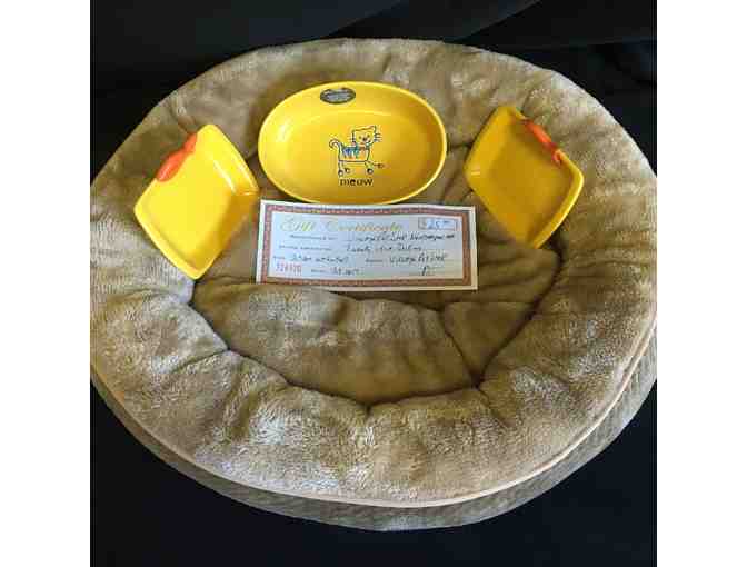 CAT BED, DISHES AND $25 VILLAGE PET GIFT CARD