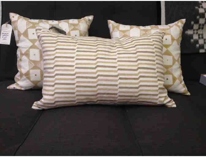 Printed and sewn by craftspeople in India, the Highline and Broadway pillows are knife edge and double sided, with hand stitched silk zipper pulls. The Highline pillow measures 25" x 15.5" while the Broadway pillows measure 17" x 17.5".