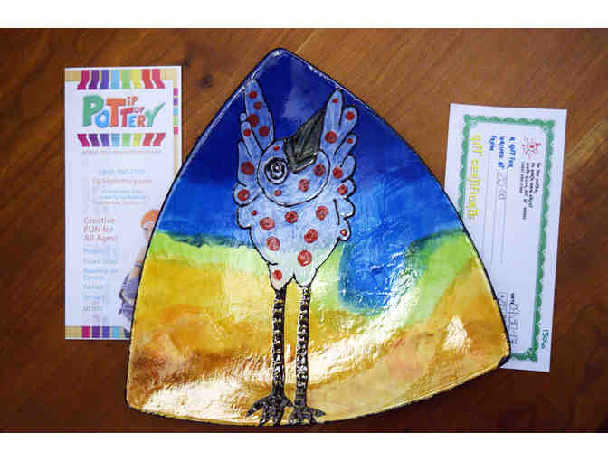 Enjoy $20 to Tip Top Pottery and take home a triangular plate with a painted bird.