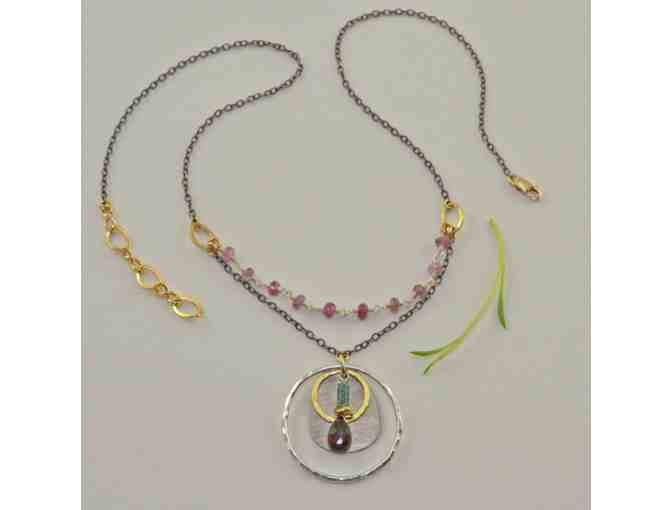 Love and Light Necklace: You'll love the red and pink hues that compliment each other beautifully, in this two tiered garnet and pink tourmaline pendant necklace. A red faceted garnet, highlighted with three aquamarine stones, rests on oxidized sterling silver while encompassed by a large hand hammered sterling silver circle. Pink tourmaline stones float gently above this gorgeous centerpiece and connects into an oxidized sterling silver chain. This handmade gemstone necklace is lightweight and comfortable to wear, perfect for any occasion.