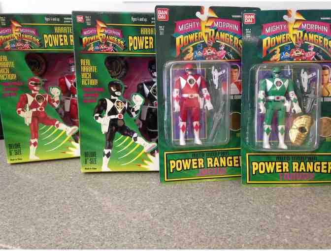 Four unopened Mighty Morphin’ Power Rangers action figures. Great toys and collector’s items! Still in original packaging! Collection includes two 8” Karate Action Power Rangers (Zack and Jason) and two 5” Auto Morphin’ Power Rangers (Tommy and Jason).