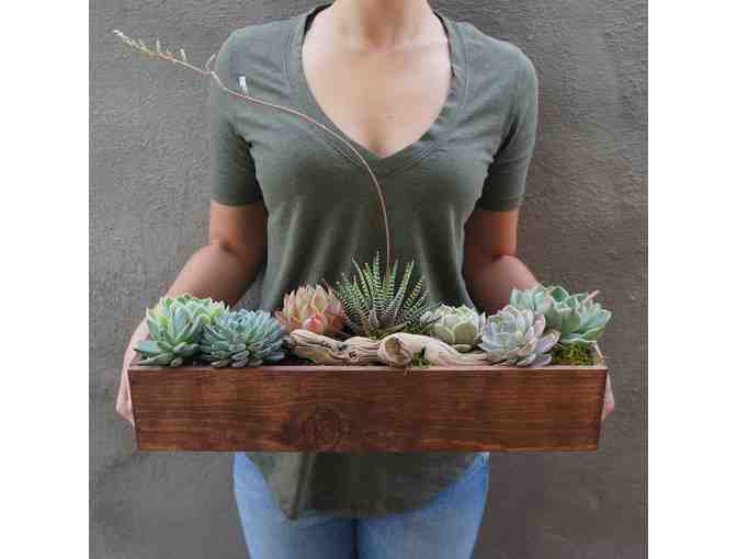 Winning bidder will receive a "Meadow" arrangement which features a 16" by 4" handmade wooden box filled with our finest succulents and accented with a piece of weathered driftwood.