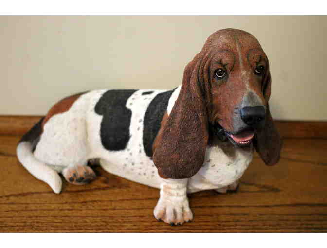 He is in perfect condition with no flaws and measures approx. 9" W and 7" T at the farthest points.  He has a sticker on his base Stating "Basset Hound" by Danbury Mint