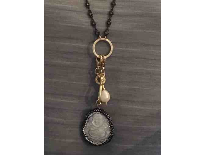 A 36" sterling, black rhodium & vermeil necklace with mother-of-pearl Buddah and removable charm