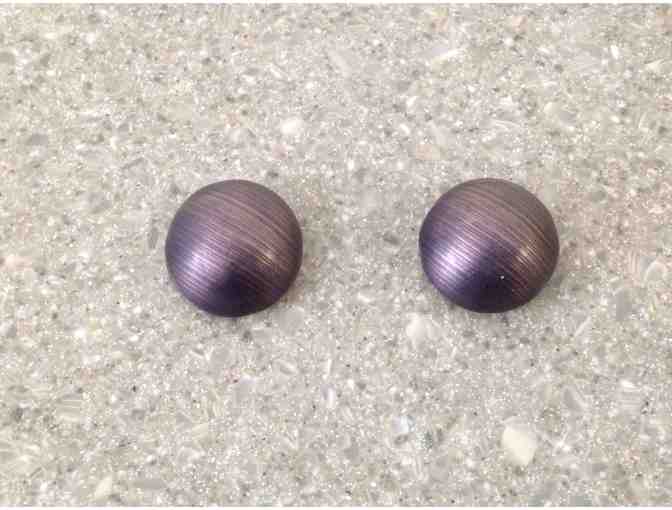 These lovely estate jewelry earrings will appeal to anyone of discriminating taste. Subdued blue-green in color with oil-spill purple and rounded button shape, these earrings appear to change color in some light. They will compliment a variety of fashion looks.
