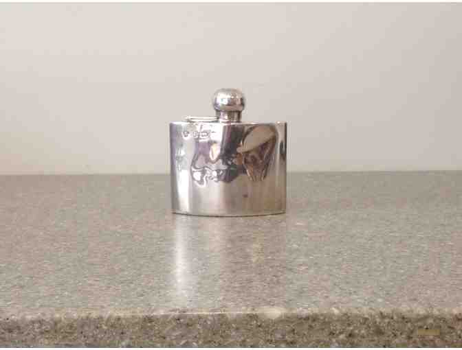 Handsome, gently used antique sterling silver pocket flask. Carries English hallmark engravings on top, front, and bottom. Rounded button spin top.