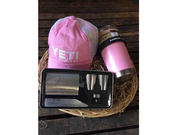 Love to keep things ice cold in a YETI? Basket includes a pink hat, 20 oz tumbler with handle and hip flask set.