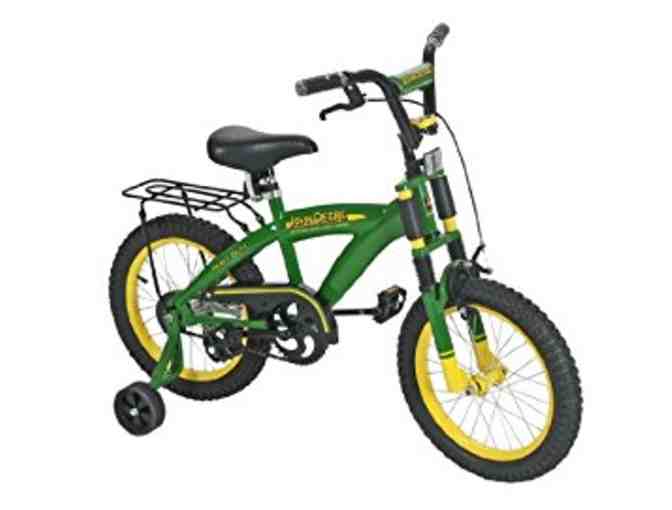 This John Deere 16" Boys' Bicycle in Green is ideal for beginners who are just learning how to ride. It features a heavy-duty frame with front shocks, a rear coaster brake and a front hand brake. Training wheels are removable. This 16" bicycle can support a weight of up to 100 lbs. Assembly instructions are included.