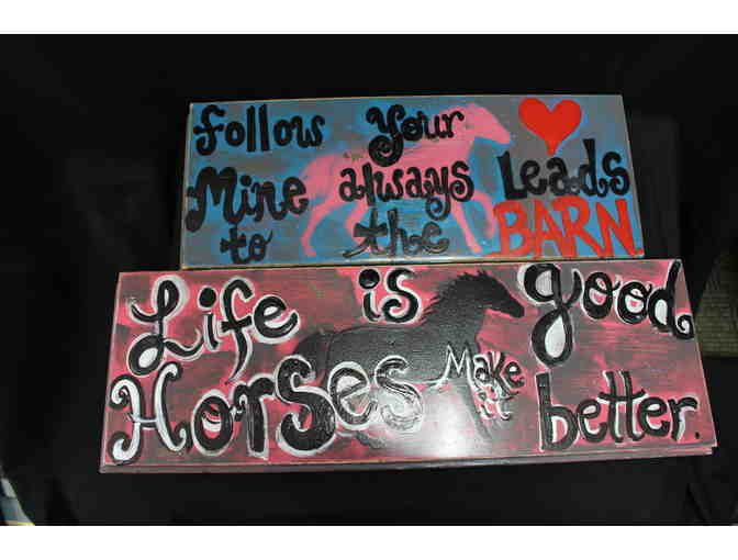Find the perfect spots for these two handpainted signs. One proclaims "Follow Your Heart - Mine Always Leads to the Barn" and the other says "Life is Good. Horses Make It Better."