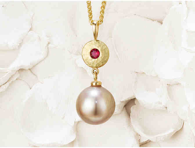 The Shield Pendant: A marriage of ocean and land, this pendant features a 11-12 mm lustrous Kasumi pearl, accompanied by a 18 karat hammered reclaimed gold setting with a ruby accent. The bright and eye clean 3 mm, 0.13 ctGemfield's ruby marks the center. Dimensions 3 cm top to bottom Accompanied by a 18 karat solid gold, 1.3 mm braided wheat chain.