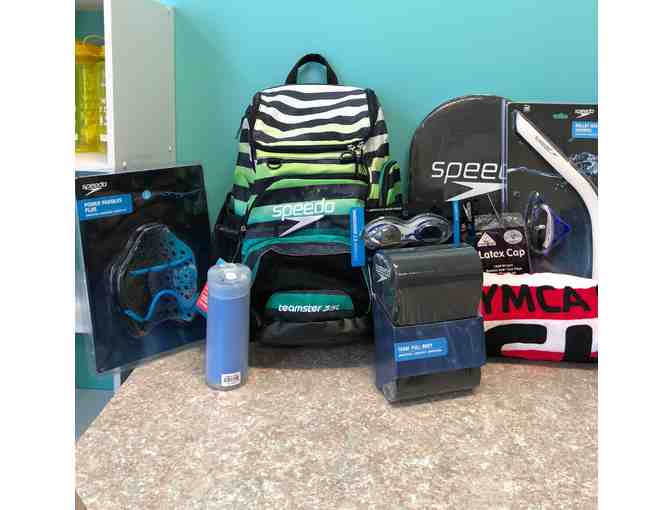 *And all of this fabulous swim swag!!! Silicone Swim Cap, Latex Swim Cap, Drying Chamois, Speedo Vanquisher 2.0 Mirrored Goggles, Speedo Team Pull Buoy, Speedo Power Paddles Plus, Dolphin Kick Balls, Speedo Bullet Head Snorkel, Speedo Team Kickboard, YMCA of the North Shore SHARKS Towel and Water Bottle