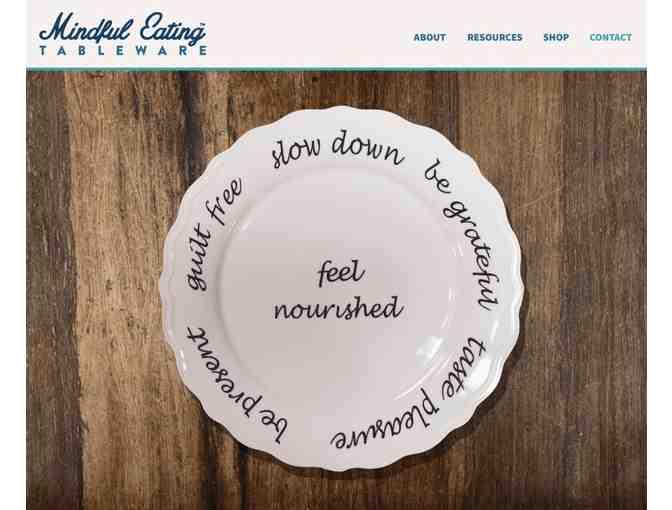 A set of 4 dinner plates. Each plate has mindful eating reminders around the rim of the plate.