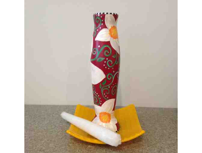 This beautiful handpainted candlestick has been lovingly created by Bath, Maine artist, Tonia Hennessy of "A Second Look." This rich red candlestick is adorned with white and yellow flowers, thin green design, and a black-and-white checkered rim. Includes a vintage yellow glass plate with rounded corners, and a small white candle.