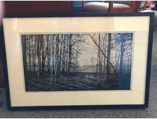 The custom-framed print is a traditionally executed hard ground etching titled Forest Edge. It is based on a spot near Amherst College where the artist once taught.