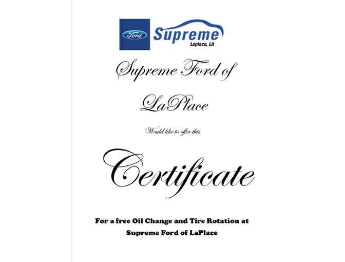 Supreme Ford of Laplace would life to offer 1 free Oil Change and Tire Rotation
