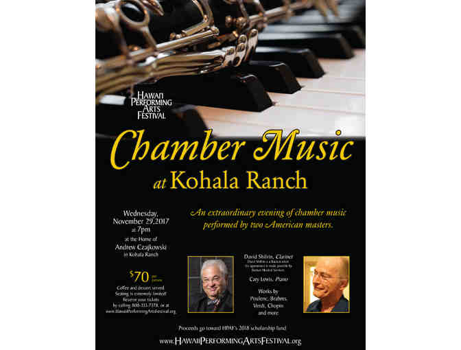 An extraordinary evening of chamber music performed by David Shifrin, clarinet and Cary Lewis, piano at a private residence in Kohala Ranch on Novermber 29, 2017 at 7 p.m. Works by Poulenc, Brahms, Verdi, Chopin and more. Dessert and coffee will be served.
