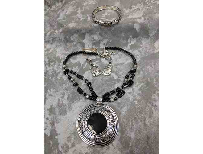 Chico's silver and black necklace and earrings with a complimentary bracelet. The necklace has a large circular amulet. The bracelet has four section elasticized section. Earrings are silver-toned textured drop earrings with beaded accents.