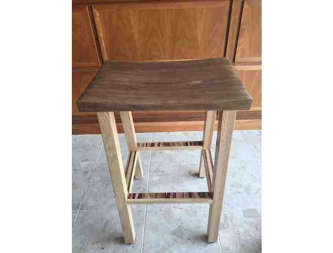 Stunning handmade stool. Likely hickory and oak. Slight curve to the seat with ornate wood inlay footrests.