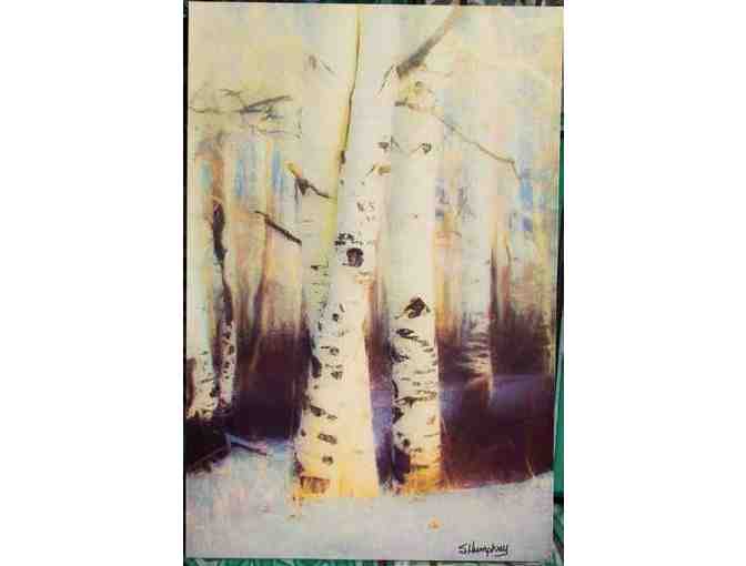 This pair of Quaking Aspens, by Susan Humphrey, grows along side the Last Dollar Road near Telluride and the original True Grit Ranch. I have tried to paint them in each season and just love the eternal embrace that the trees have grown into.
