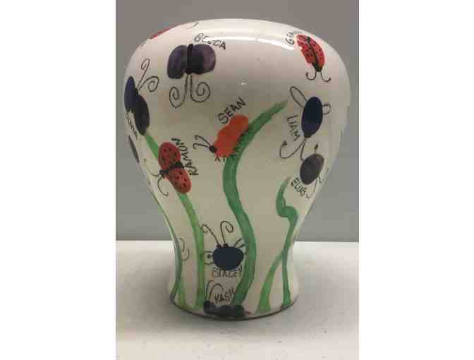 8" white ceramic vase decorated with the children's fingerprints as bugs and butterflies.