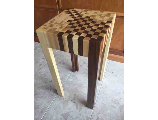 Beautiful handmade stool by Bruce Epstein. Mixed woods, likely ash and walnut, in an attractive geometric checkerboard pattern. Solid stool or small table.