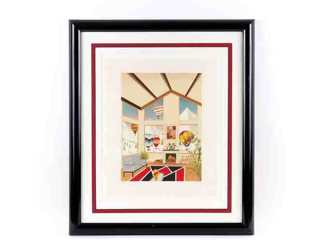A signed limited edition color lithograph titled Aspen Chalet by Fanch Ledan in beautiful condition. This print depicts a modern style cabin’s interior, with the image focused on the large windows overlooking snow covered mountains and colorful hot air balloons. It is signed by hand and hand numbered 114/275 under the image. The frame is new, with double matting of red and white. Archival glass. The piece measures 28" x 24".