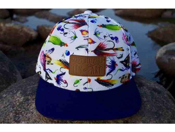 One-size, custom design flat brim hat with snap back by  Mandy K. Herzfeld  a fly fishing guide and fly fishing artist based in Minturn, CO