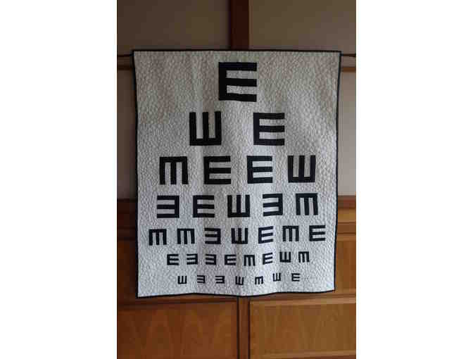 Stunning handmade black and white quilt, entitled I Can See Clearly Now, depicting the classic "Tumbling E" chart. Hidden in the longarm stitching are eyeballs! Can you see them? Perfect for your office or home!