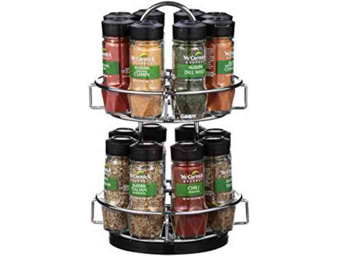 A metal two-tiered spice caddy for the adventurous cook. It's filled with 16 gourmet spices and herbs to inspire you; wonderful meals start here.