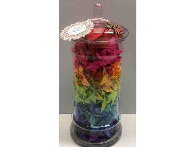 The students of the 5th grade class wrote prayers and blessings on small pieces of paper then beautifully folded them to create cranes to fill this vase.