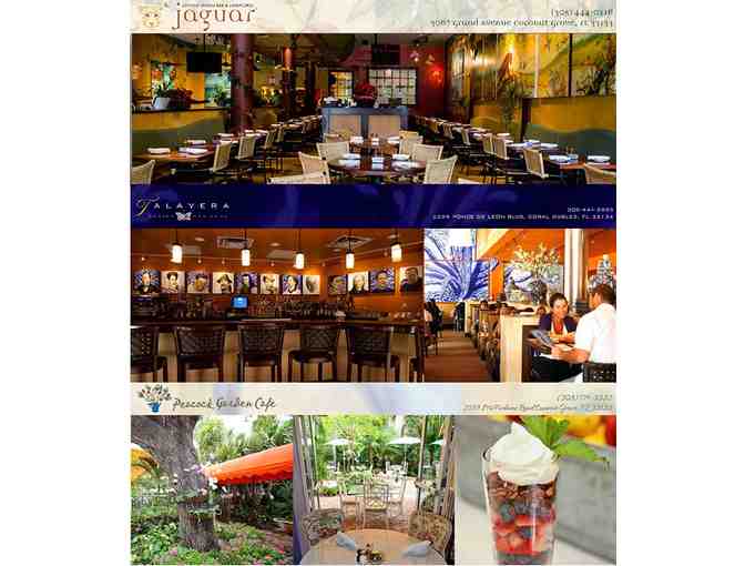 Enjoy $50 to any of the 3 restaurants in the Jaguar Hospitality Group. The Jaguar Hospitality Group has 3 Miami-based restaurants: Jaguar Ceviche Spoon Bar & Latam Grill, Talavera Cocina Mexicana, and Peacock Garden Cafe. Each restaurant has its own delicious flavors and unique dishes!