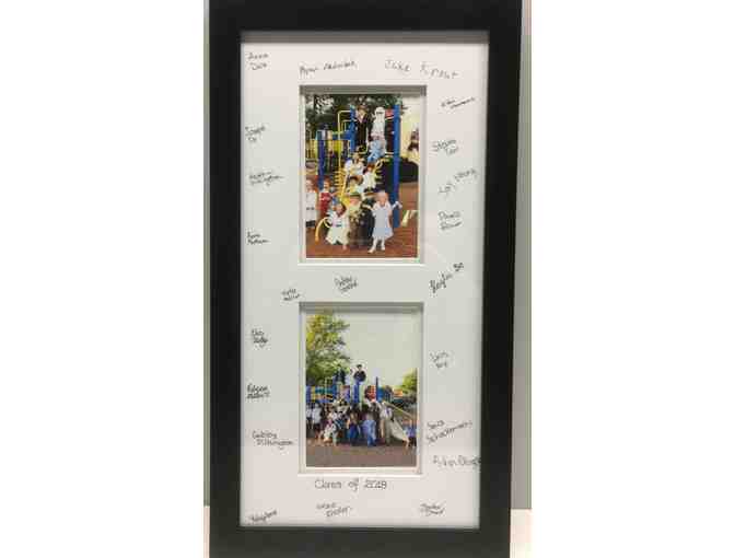The students from St. Pius X Class of 2018 recreated the photo of what they wanted to be while they were in Mrs. Folluo's kindergarten class. That photo is framed with the original photo.