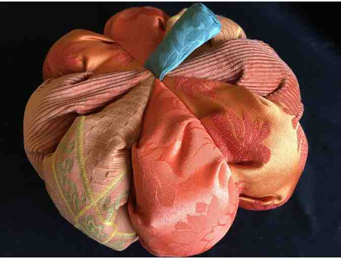 This orange fabric pumpkin is created of vintage, Italian fabrics which the artisan collects from local markets Once the fabric is pieced together, it is stuffed and adorned with a fabric stem.