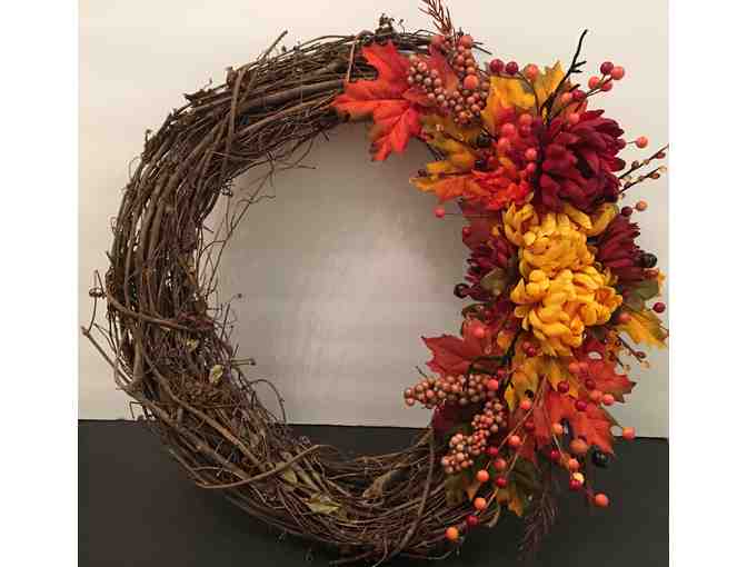 Spruce up the front door with this handcrafted fall wreath. Embellished with flowers, leaves and berries, all eyes will be drawn to this beautiful custom piece.