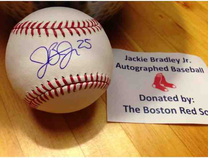 This baseball was donated by the Boston Red Sox and has been signed by right fielder Jackie Bradley Junior. JBJ is one of the Boston Red Sox - and one of their most valuable players; hi