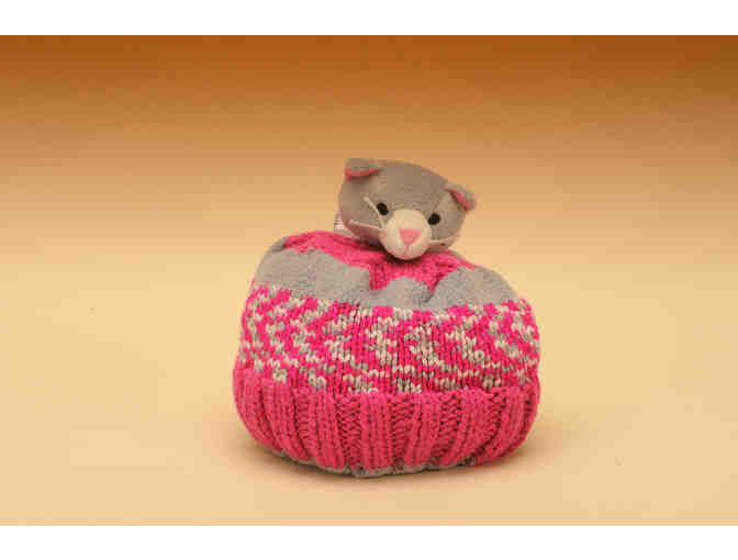 Child's hand knit "Top This" hat features a gray kitty to match the hat's yarn! In gray, white and hot pink, hat diameter is 14 inches size medium-large.