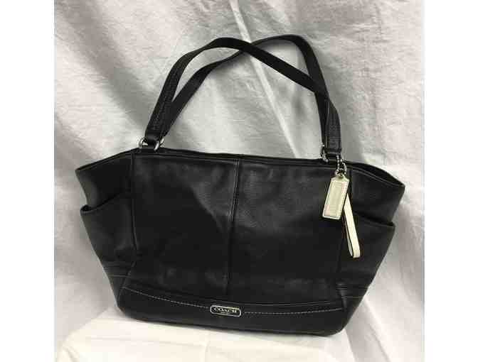 This versatile black leather Coach bag features white contrast stitching and side pockets.
