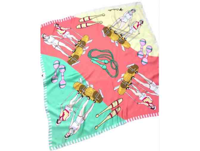 Bid on this delightful silk scarf donated by Flower Power in Point Reyes Station. This Centinelle scarf measures 90 x 90 centimeters and has a retro pop print, featuring 20s girls doing sports, on a green, coral and light yellow background.