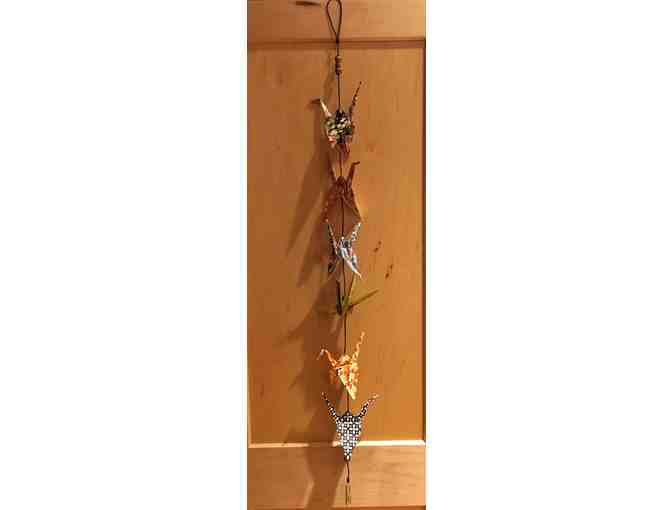 This one-of-a-kind, hand-crafted paper crane mobile was made by our own Nurse Heather Fergerson!!  This is sure to brighten up any room in your home or would make a beautiful gift.  This is made out of quality paper, complete with a beaded loop for hanging and a weighted ornament below the last crane.