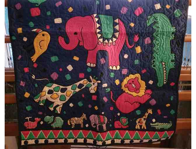 The 2ftx3ft quilt includes delight jungle animals including elephants, crocodiles, lions, girraffes, and parrots in bright beautful colors.