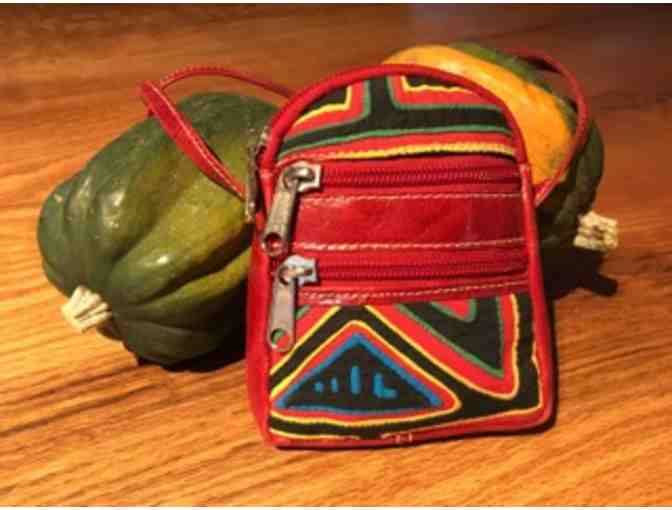 Crafted by hand with the best quality of Colombian leather. Two zipped pockets hold small cash, credit cards, a small cell phone and other essentials. Leather shoulder strap. Finished with a colorful and vibrant Mola design on the front. Measurements 5.5X4.5 inches. Color: Gloss Red