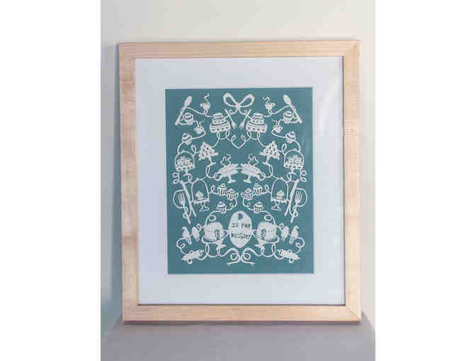 Dazzling and original, this one-of-a-kind papercut is mounted, framed, and ready to hang in your home. In a natural frame with cream-colored mat and soft green background, this piece quietly and creatively states D is for dessert, all with yummy cutout images; it will fit beautifully in any environment. Annie Howe's papercuts are intricate, detailed, and cut with care; each piece tells a story. Image size is 9" X 7" in a 14" X 12" frame.