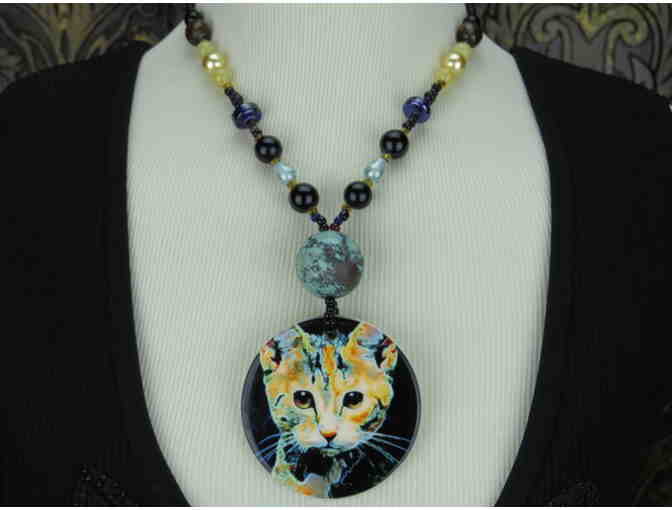 "ARTY CAT": 1/Kind Fabulous w/Porcelain ART Pendant, Turquoise, Onyx, Yellow Jade +++