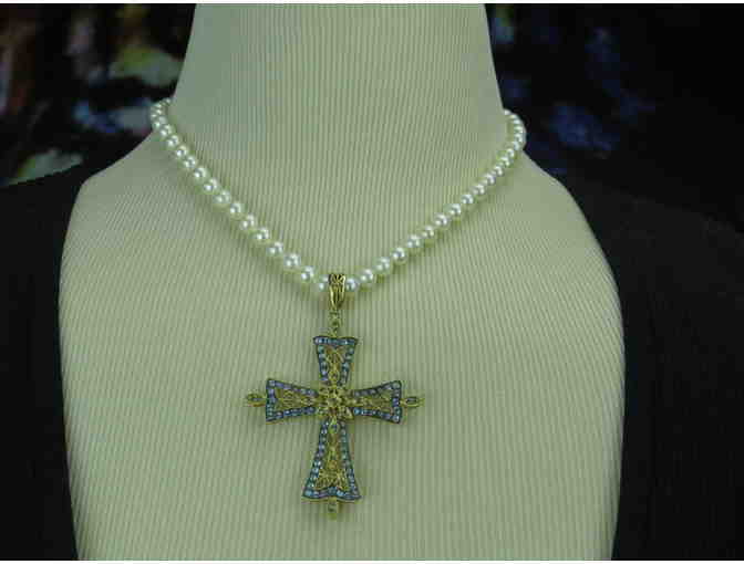 N6:  Exquisite Bold Enhancer Cross w/Blue Topaz, Diamonds, on Pristine White Pearls!