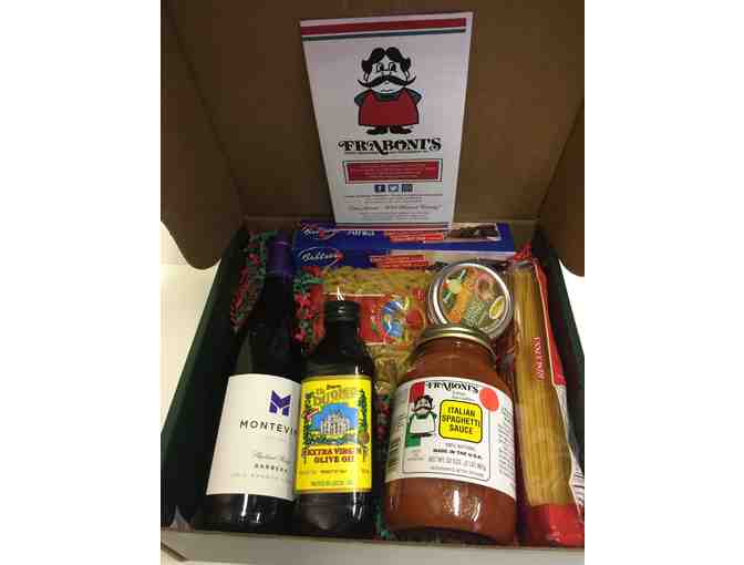 This delicious basket of goodies from Fraboni's includes wine, extra virgin olive oil, Fraboni's Italian Spaghetti Sauce, gluten free spaghetti noodles, Tuscany Blend bread dipping seasoning, 100% Durum Wheat Semolina pasta and dark chocolate wafer crisps.
