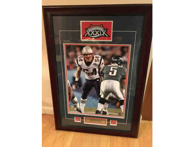 Get your hands on this Supberbowl XXXIX signed picture in frame, from Teddy Bruschi! Show your New England Patriots football spirit with this piece to put around your home, and impress your guests! Approximately 2' by 3'.